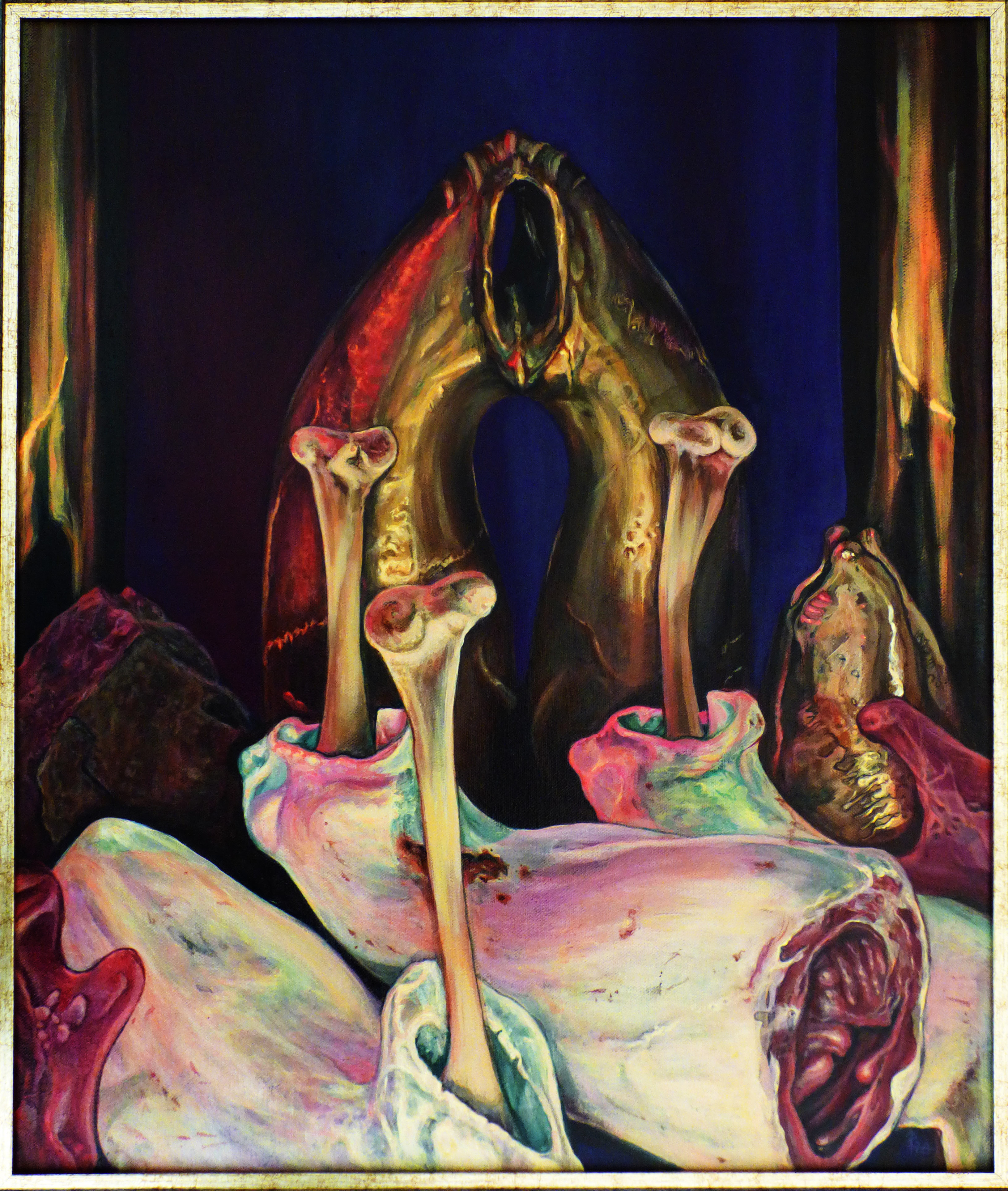 In this painting, a still life layout was created using castings of wax figures, interpretating a scene from Homers’ “Odyssey” where Odysseus and Penelope are re-united. In this work themes such as The Grotesque, Metempsychosis, and The Surreal are explored.